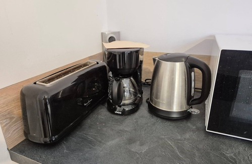-> A dining area, a fully fitted and equipped kitchen (hob, microwave, fridge, toaster, filter coffee maker, kettle…). Everything you need to cook is at your disposal. A welcome kit is provided, including tea, coffee, sugar, and biscuits..
