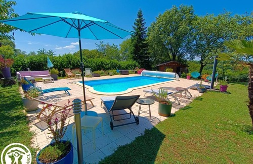 On a very beautiful park with trees and flowers, in a calm and isolated environment, Andrée welcomes you with happiness in her pleasant cottage Le Chalet. Close to Figeac, with all the shops, services and leisure activities, the cottage Le Chalet is a charming one with all the comfort you are looking for. Here we like the beautiful bright living room, the spacious and comfortable bedrooms and all the quality equipment made available, we also appreciate the exteriors conducive to good moments of relaxation with friends or family. And we love Andrée and her incomparable sense of hospitality! House adjoining the owners' house, not overlooked, privacy totally preserved on the 2 terraces. On the ground floor: large living room with direct access to a 40m² terrace overlooking the park and the swimming pool and furnished with a lounge area, a fully equipped kitchen area also has direct access to another terrace, a bedroom with a 160 bed, shower room semi open to the bedroom, wc. Upstairs, 1 bedroom with 1 double bed, 1 bedroom with 1 double bed and 1 bunk bed with 2 single beds, shower room and toilet. Electric heating, wifi. Private enclosed garden. Shared park with the owners, private swimming pool secured by an alarm (8x4 and from 1.20 to 2m deep).