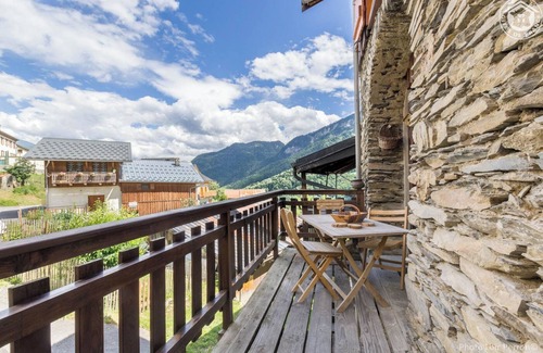 Gite in terraced house. 1 + 2è + 3è floors: kitchen corner living room, 3 bedrooms (1 double bed 2 p, 1 1 p./1 bed 2 p./1 bed 2 p), a bedroom on the mezzanine (1 bed 2 p, 1 bed 1 p) with room b suite (bathtub), bathroom. Balcony-terrace. Ski Combelouvière binding Valmorel 4 km Valmorel/Grand field 11 km. Total floor area: 102 m 2. Village house renovated in the heart of a small village. Southern hillside is. Warm mountain chalet atmosphere. Charm and character with doors and old fittings. Decoration. Views of the village and the mountain. Garage in old vaulted stables.