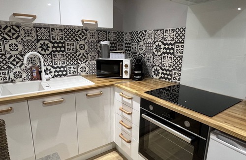 The kitchen is fully equipped (crockery, glasses, oven, microwave, kettle, Nespresso coffee machine).