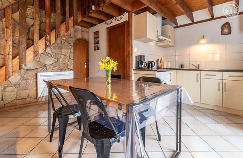 Duplex gîte, adjoining the owner's house. Independent access via the terrace (2 wooden steps): kitchen-living room, bathroom (shower and toilet), 1 bedroom (1 double bed 140x190 cm). 1st floor: mezzanine bedroom (3m2 Carrez law) with 1 single bed 90x190cm. Terrace and private grounds. Private parking (1 space). Sheets included, beds made. Total floor area, including attics: 45m². Duplex cottage in a country house, located 2 km from the Granier slopes and in the immediate vicinity of the town centre on foot. South-facing hillside. Typical residential hamlet in the heart of the Chartreuse Regional Natural Park. Pleasant, preserved natural setting on the edge of the forest and river. Large exposed terrace and grounds. Superb panorama.