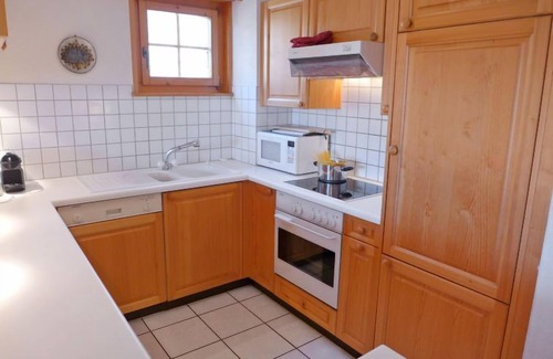 "Le Miclivier B1", 5-room maisonette 120 m2, on the ground floor. Bright, practical and comfortable furnishings: living/dining room 58 m2 with open-hearth fireplace, dining table and TV. Exit to the garden. 1 room with 2 beds (90 cm), bath/WC. Exit to the garden, south facing position. 1 room with 2 beds (90 cm, length 200 cm). Open kitchen (oven, dishwasher, 4 ceramic glass hob hotplates, toaster, kettle, microwave, freezer, electric coffee machine, Capsules for coffee machine (Nespresso) extra, raclette grill, fondue Set (cheese)). Shower/WC. On the lower ground floor: (spiral staircase), 1 small room, without wardrobe with 2 beds (90 cm, length 190 cm). 1 small room, without wardrobe with 2 beds (90 cm). Large terrace 36 m2, garden. Terrace furniture, barbecue. Beautiful view of the mountains. Facilities: iron, baby cot, hair dryer. Internet (WiFi, free). Garage space n B1. Please note: non-smokers only.