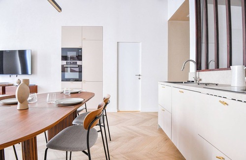 Plongez au cœur de Marseille depuis notre appartement de 60 m2 Rue de la Paix Marcel Paul, à proximité immédiate des Halles du Vieux-Port. Lumineux et équipé d'une cuisine haut de gamme Miele et Smeg, il offre une vaste pièce à vivre accueillant un salon confortable et une télévision. Les 2 chambres climatisées, chacune dotée d'un lit double (160x200), télévision et rangements, garantissent intimité et repos. Chaque chambre dispose également d'une salle de bain privative avec douche à l'italienne, meuble vasque et sèche-serviette électrique. Un canapé-lit dans le salon offre un couchage supplémentaire pour 2 personnes. Une connexion Internet haut débit (Fibre) est disponible. Le logement n'est pas adapté aux personnes en situation de handicap.