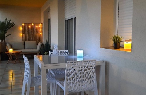 - A 20m² south-east-facing balcony equipped with two sun loungers, a table for four (extendable) with four chairs and cosy seating area with small sofa. Each room (living room/kitchen and the two bedrooms) has direct access to the balcony.