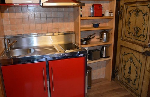 Living-dining room with 2 armchairs, dining table with chairs and flat screen TV. WiFi. Very small open-plan kitchenette (with 2 hotplates, coffee machine with capsules (Nespresso) as well as a fondue- and raclette-set). 1 double bed (180x200cm) in a small room beside the living room, separated with a curtain (in the pitch of the roof). Small cupboard and dresser. 2 single beds (90x200cm) on the gallery (not suitable for infants). Access by small stairs without handrail. Bathroom with toilet and shower. Small balcony with garden furniture. Store room for skis and sports equipment.