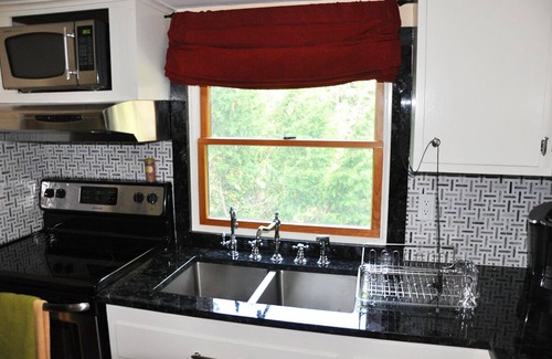 The main floor is a 2 bedroom unit with a sunroom ( Rick's room - was Rick Danko's quarters), living room with sofa, writing table & chairs at the picture window, wood-stove/fireplace. It opens into the Dining Room, which has a antique dining table & chairs for 6. The kitchen, as does much of the house, maintains the mid-century period look, with forest views east. The main bedroom has a queen-sized bed, desk, sitting area & full closet. The second bedroom has 2 twin beds, dressers and side tables. The sunroom had a futon twin couch ( which folds down to become a sleeper). The sunroom has its own back entrance, and opens to the lawn and old out-door fireplace for campfire evenings.