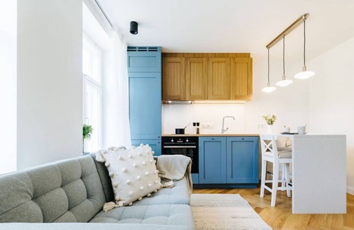 The private apartment stands out for their elegant Scandinavian style and unique layout, natural oak herringbone flooring and light tones create a timeless and cosy ambience.