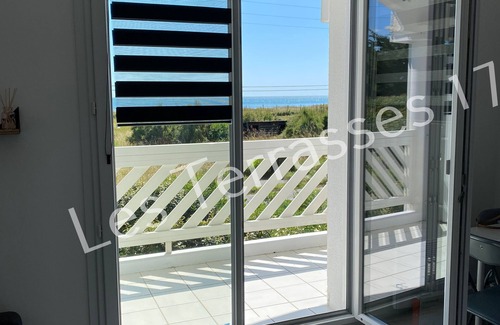 In Saint Pierre d'Oléron, La Cotinière, facing the ocean, our refurbished apartments for 2 to 5 people each, with a living room including a fitted kitchen and a lounge with sofa bed, TV and free WiFi, a balcony with ocean view, 1 bedroom and a mezzanine, shower room and separate toilet, a private parking space in the residence.