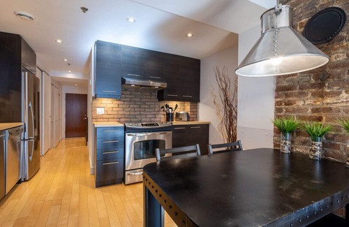 The beautiful combination of metal, wood and origin bricks enhances the ambience of this bright industrial style condo located on the second floor of an entirely renovated Old Port building.