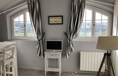 Perched on the 2nd floor of a beautiful Anglo-Norman manor house, this bright studio apartment boasts uninterrupted views over Pourville bay and its cliffs. The 35 m2 are divided by a living room with 2 beds (90 x 200cm) that double as sofas during the day. A high table for 4 people allows you to enjoy your meals while looking out over the bay of Pourville.The kitchen is fully equipped (dishwasher, ceramic hob, extractor fan, microwave, oven, coffee maker, toaster, electric kettle, etc.).The bathroom at the far end has a lovely shower with sky shower head, a large washbasin and a corner toilet.The beach and Pourvillle promenade can be reached in just a few minutes.Pourville offers a bakery, a delicatessen, several restaurants and terraces, miniature golf, bike hire and beautiful walks in the surrounding area. The Dieppe Pourville golf course is 2 km away and the town of Dieppe 4 km.