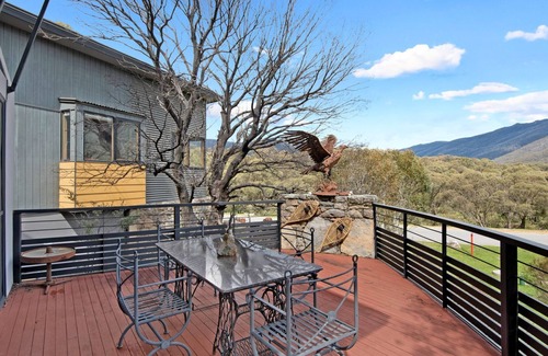 This spacious Chalet offers fantastic views of Thredbo Valley from the open plan kitchen and living through to the balcony which offers a large outdoor dining area, BBQ and stunning metal eagle perching on the balconies edge.
