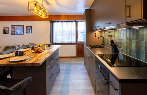 The open-plan living area also includes a fully equipped kitchen with everything you need, from a full-size oven and hob to a dishwasher, making it easy to prepare meals during your stay, the kitchen island hosts 6 comfortable stools for dining. The living room with its large L-shaped sofa and smart TV ensures plenty of options for evenings indoors after a long day exploring the mountains in the Chamonix Valley.