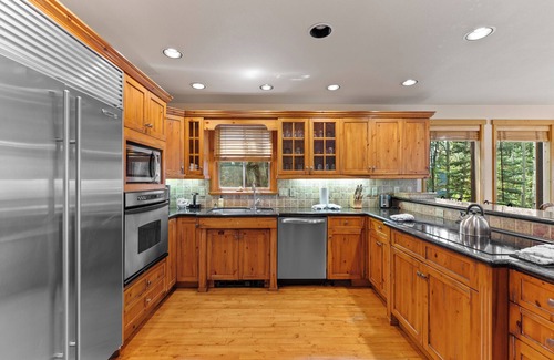 The full-sized kitchen is stocked with all the cookware, knives, glassware, appliances (coffee machines, blender, crockpots, waffle maker, etc.) and tableware to make a gourmet meal and features granite countertops and stainless-steel appliances. The dining area can seat ten and there are four additional seats at the breakfast bar. Access to the rear deck is just off the dining area. Enjoy the beautiful views and the fresh mountain air on the extensive patio furniture.