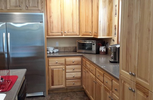 There are three private bedrooms and two full bathrooms. There is a California king bed in the main bedroom, a regular king bed in 2nd bedroom, and two twin beds in the 3rd bedroom. Handmade benches by Missouri River Timber are in each king bedroom for suitcases. Come be our guest at 308 Bridgefield Dr in Labadie MO.