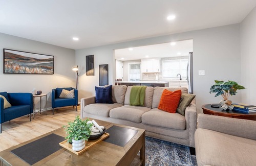Head upstairs to the 4 bedrooms and 2 full baths. The King suite with an en-suite bath has a deluxe luxury shower. The Family guest room has a Queen bed and futon that folds out to a full bed. The 2nd Queen bedroom features a dedicated work space with a desk and chair in a sunny private alcove. The 4th bedroom features a full bed. The 3 guest rooms upstairs share the hall full bath with a shower/tub combo.