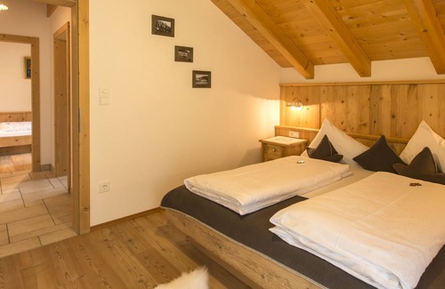 Apartment Alpenrose: The apartment "Alpenrose" is on the top floor and has an area of 66 m2. It consists of two comfortable bedrooms, anteroom, bathroom with large sink, shower, bidet and toilet as well as a 24m² kitchen with living area. A large dining table with a seating area, a comfortable sofa and a tiled stove give the rustic apartment - furnished in antique spruce - a cozy, homely atmosphere.