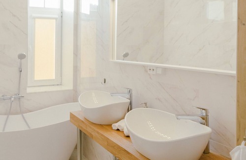 There are 2 bathrooms in the apartment- one with a shower and one with a luxurious bath.