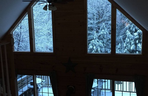 Upstairs in the master bedroom, wake up in your comfy log queen bed and catch the sunrise through the upper windows. Enjoy your own half-bath, sitting room with loveseat that opens to a single bed, with plenty of room for a pack 'n play if needed. A highchair, crib, toddler bed, and various other baby items are available upon your request. All closets and dressers are fully available for your use throughout the house.