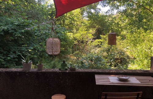 Like a cabin, between forest and river, with a terrace facing the garden. | Apartment in Rennes-les-Bains