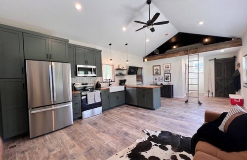 - Custom kitchen with full-size fridge, butcher block counters, farmhouse sink, electric range, and modern cabinetry