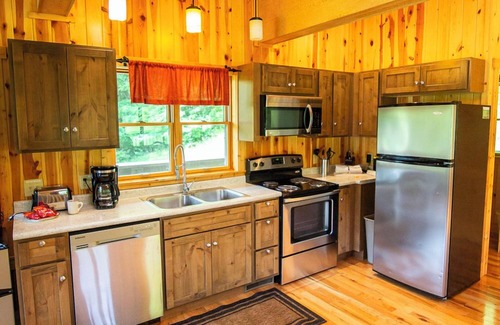 This Chalet in Ohio's Hocking Hills hits the marks for renters with discriminating taste for modern amenities. Both bedrooms have king beds and en-suite baths with double vanities and large, walk-in showersThe bright, open-concept, living area of the top floor is wrapped in windows and a deck. The kitchen has stainless steel appliances, including a dish washer. The living area features a charming gas stove fire place, as well as satellite tv and wifi. Outside, the fire pit, charcoal grill and wrap-around deck overlook the private, stocked, fishing pond. The hot tub is tucked around back, into the hillside. Newly paved driveway is suitable for cycles, bikes and sports cars. No pets allowed.