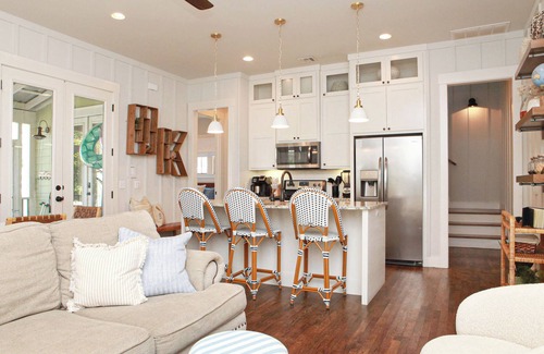 You will arrive to a relaxing screened-in porch complete with a cozy outdoor fireplace and swinging chairs. Enjoy meals with both an indoor and outdoor dining table. The interior includes a spacious loft area with built-in bunk beds and a play area for the kids.