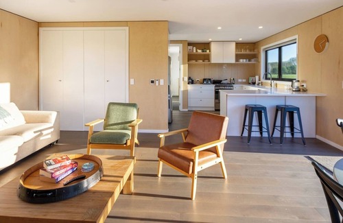 The living area features a comfortable sofa, ideal for relaxing while admiring the stunning outdoor views. For entertainment, there’s a 43-inch smart TV and fast, reliable WiFi, ensuring you can stay connected and stream your favorite shows. In winter you can also snuggle up in front of the wood fire and utilise the supplied board games and books.