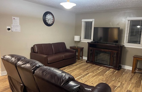 Stay connected with WiFi. Enjoy movie nights on the two leather sofas next to the cozy warm electric fireplace. Cook on a stainless steel gas stove, 6 sets of dishware and utensils included. Basic cookware included. Dinning room seats up to 6.