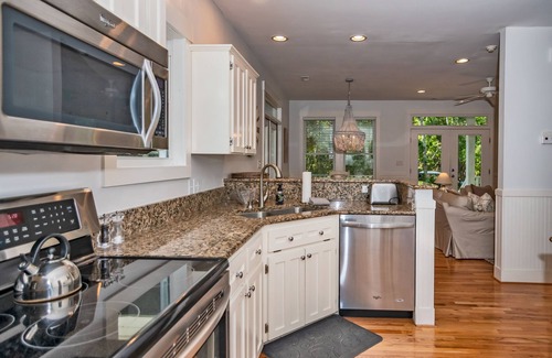 4 Live Oak Trail is your home away from it all! We do have a fully stocked home along with 2-4 passenger golf carts. We know how important it is to have the simple conveniences on vacation making your trip worry free. As far as our home layout we have an open floor plan with a bedroom (King), full bath, kitchen, dining and living room downstairs. Upstairs is a bunk room (2 twins), a master suite with bath (Queen) a sitting area and a full bath. We are centrally located on the island. We are less than 5 minutes from the ferry and the beach and about 2 minutes from the grocery store and all the maritime shops. We know you will enjoy our home as much as we do!