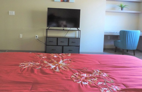 Lively and Exuberant Comfort, bursting with color, offers 1 bedroom and 1 bathroom, but can comfortably sleep 4 people. Enjoy each other's company in 834 sq. ft. with a surprisingly spacious bedroom boasting a king bed with a new and comfy memory foam mattress, in-suite full bath and a smart TV with Roku streaming. The living room is big enough to congregate and pile up on the lively red sofa to watch your favorite show or movie on the smart TV in the living room, also with Roku streaming. A full kitchen, with all of the basic cookware, utensils and seasonings, will give you the opportunity to showcase your culinary skills while you save money on dining out. A table for two awaits an intimate meal with someone special or include everyone with additional seating at the kitchen bar. Don't worry about who is going to do dishes after, just load them in the dish washer and enjoy your time. When the day grows long and it is time for bed, if there are more than two, the lively red sofa conceals a fold out queen bed to comfortably sleep your +1 or +2. In the morning after a restful sleep, get your day started with a hot cup of coffee or tea and enjoy it on the private front porch. Don't pack your dirty laundry back home, use the in-suite laundry with detergent and dryer sheets provided to save some time when your relaxation time is done and you have to return to your normal routine.