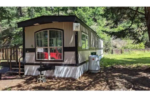 12x44 2bdrm park model home located 2 minutes North of the hamlet of Boston Bar in an established trailer park. Above ground solar heated 12'x4' pool, inflatable 4 person Saluspa hot tub. Ample outdoor seating and dining with Bbq. Pet friendly. Life in our trailer park moves pretty slow. Large Fir trees on lot. Air conditioning, Roku, Firestick, 2 t.v.s, music streaming Recently painted to add character. Queen bed in main and two twins in second. Couch in living room has bedding ready to go on bin under second bedroom bed. Alexa