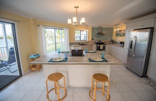The first floor of this beautiful Fresh Creek Adventures home has been completely renovated. Two large bedrooms, two bathrooms, full kitchen, tv sitting area and large island for meals.