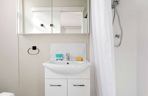 The bathroom has a shower, vanity and toilet and all linen and towels are provided as well as some toiletries, hairdryer, an iron and ironing board. There is a communal coin operated laundry for your use in the building.