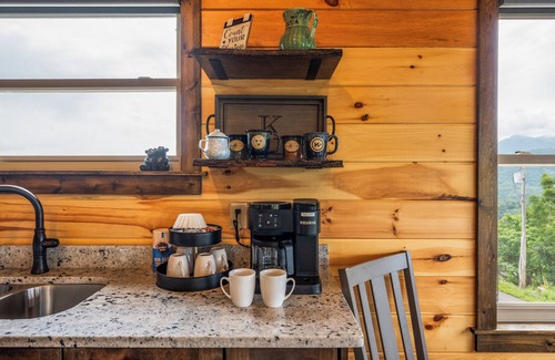 The Eagles Nest cabin has fantastic unobstructed mountain views where you can see for miles. The open concept living area provides plenty of seating to watch TV or sit by the fireplace. The dining room and kitchen island are available for eating while you enjoy your absolutely amazing panoramic mountain views. The kitchen provides the best amenities and cookware to cook a fantastic meal and enjoy the mountain view.