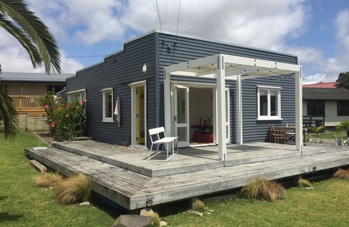 Character bach in great location....We are only 2 minutes walk from the centre of the beautiful Raglan township (think quirky shops, great cafes) and 1 min walk to harbour and safe swimming. The beach, playground and skate park are only a short walk across the foot bridge. Ngarunui surf and swim beach a 5 minute drive away. You cant beat this central location. Two bedrooms (both queen beds). Fully furnished with fun retro style. Has all the modern appliances, cutlery and utensils for your stay away from home.