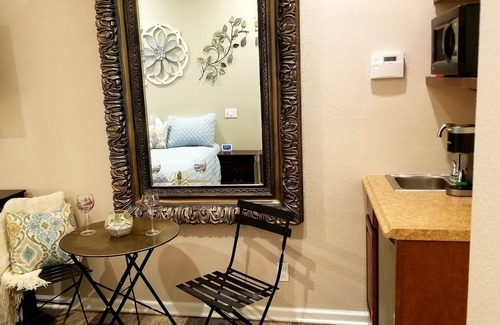 In the heart of Palm Desert, this beautiful upscale cozy casita with private entrance is located in a quiet neighborhood steps from El Paseo, the Westfield Mall, Trader Joe's, Whole Foods, The McCallum Theater, Civic Center Park, The River Center, and major hiking trails. Keurig with complimentary pods, wifi, cable, movie channels, and private central air. Traveling with another party, but want separate space, we have a second casita, inquire. Discounted rates offered at 760 then 808 then 7219.