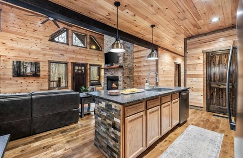 Escape to Turn The Page Cabin, a 2021-luxury cabin blending modern-rustic charm with ultimate comfort. Nestled in a cul-de-sac with a mixture of native mature forestry, this 2,100 sq ft open-concept retreat is surrounded by whispering native nature trees and a tranquil seasonal creek. With warm wood accents, stone details, and a stunning floor-to-ceiling gas log fireplace, plus vibrant granite, slate, and quartz, it’s cozy yet chic. In the heart of Hochatown and less than 15 minutes from Broken Bow Lake and Beavers Bend State Park, this family-friendly cabin is your year-round base for lake adventures, nature getaways, or group retreats! 🚤