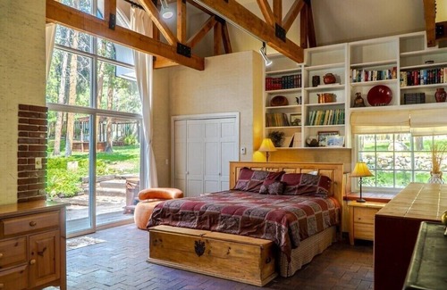 When you’re ready to tuck in for the evening, make your way to one of the three bedrooms located on the main floor. The spacious master bedroom is situated just off of the living room and boasts stunning details from its built-in bookshelves stocked with books to its vaulted ceilings and striking wood beams to the many windows which bathe this room in natural light. It is outfitted with a king-size bed, nightstands, lamps, an armchair and a desk area. Here you also enjoy private access to the truly spectacular backyard and hot tub as well as an en suite bathroom. The master bathroom features a single-sink vanity and a walk-in shower with a glass door.