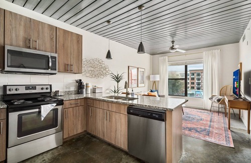 Welcome to Lodgeur at Mid Main Lofts! This trendy apartment community is in the heart of Midtown, Houston’s most walkable neighborhood. There are dozens of bars and restaurants on your doorstep and a METRORail station (3 stops to the Texas Medical Center or Downtown). This 5th-floor furnished 2BR 2BA apartment (1,264 SF) is perfect for short and extended stays, featuring a fully-equipped kitchen, washer/dryer, and a workspace with fast WiFi. Onsite, there’s free parking, a pool, and a 24/7 gym.