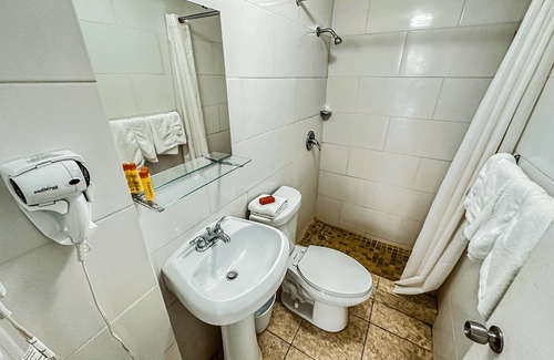 The bathroom is with shower, hot water service, towels, hairdryer, shampoo, conditioner, soap, and shower cap.