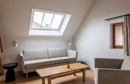 The newly renovated apartment is on the top floor of a charming, old stone house with a private closed garden. The space is approximately 100m2 (~1000 sq feet) and has two bedrooms with queen beds (160cm) and a small loft space with a full-size futon bed (140cm) accessed by a stair ladder. The garden is about 670m2, and includes a deck, outdoor tables, lounge chairs, and a lawn; a perfect spot for barbecues.