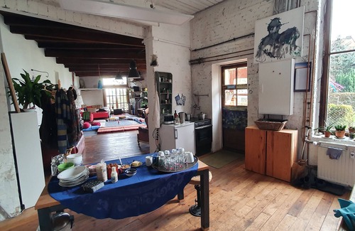 Spacious, more than 3 meters high, bright, inspiring rooms invite you to relax, maybe to be creative. The main room is 60 square meters and can be divided as needed. Habitable with 3-4 people.