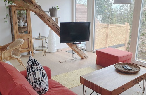 A very bright, cozy apartment with a "wow effect" in which you can feel comfortable. On our farm, we have newly built an apartment on the second floor and stylishly furnished it for you to offer our guests a special holiday atmosphere. Historic beams, visible up to the top of the roof, let you feel the old carpentry art. In combination with the fully equipped kitchen, which is cleverly integrated into the living room, the large, comfortable sitting area with a direct view of the outdoors, you can relax directly. The large windows almost make you feel like you're outside. The balcony, with a wide view over the courtyard, the meadows and the forest, invites you to let your senses wander. From up there, both from the apartment and from the balcony, you can watch our horse and the two ponies. If you want to experience pure country idyll, you've come to the right place!
