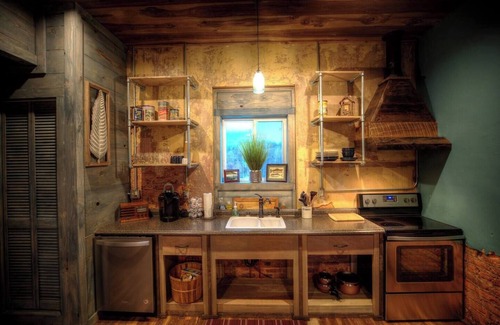 Hiking boots on, fishing poles loaded and a short canoe trip down the river lands you in one of our two 850 square foot LOFTS OVER MAIN for a restful evening to embrace tranquility. Our lofts create the nostalgia you'd expect in a shop-keepers quarters ranging from exposed brick walls, vintage furniture and romantic chandeliers. The custom cabinetry frames a modern kitchen, containing elegant stainless steel appliances and vintage tables. The 15-foot tall ceilings are accented with rustic stained wood boards and give the perfect accent to the original wooden floors from the late 1800's building. The adjustable lighting in the Lofts cast off a romantic glow to be tailored for your perfect evening. Keeping the original wood flooring, you can almost hear the shop keepers' as they are coming home from their day of work from Main Street below.