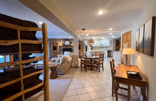 •Living room stays cozy with stone gas fireplace. Perfect for naps.