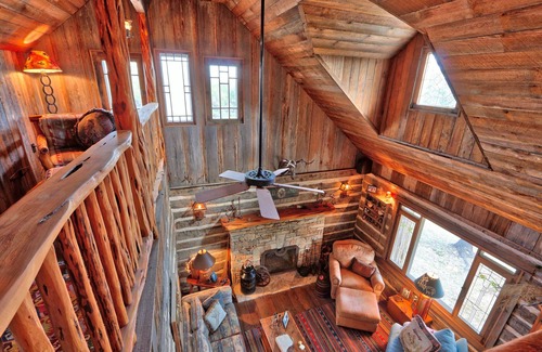Just as noteworthy as the cabin bedrooms are the specific bathroom designs chosen for this property. On the main level, you can revel in the custom limestone shower. With its unique design this shower is a piece of artwork. Admire the stained glass cabinet as well as other interesting pieces. Upstairs find a large walk in shower with colorful Sausalito tile and interesting rustic cabinetry.
