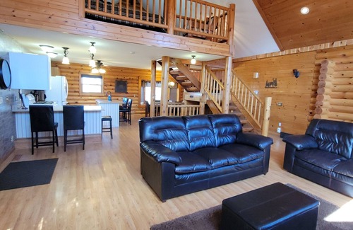 This beautiful log cabin is perfect for family gatherings, fishing and hunting trips. Sleeps up to14 guests, 5 bedrooms, 10 beds and 3 bathrooms. Close to downtown dining and shopping. Only minutes away from the Missouri River, boat docks, local airport and Interstate 90. Located just outside of city limits. Within the cabin there is loft that overlooks the living room which includes 4 beds. Main floor is very spacious with Master bedroom, bathroom, fully stocked kitchen, living room, guest bathroom and walk out front and rear decks. The lower floor has 3 bedrooms to sleep 6 guests, living area with two 2 beds, bathroom, kitchenette and walkout basement. Backyard is private and spacious with propane fire pit. Front and rear decks are provided with outside furniture and a propane grill. Large yard, swing set and playhouse. Attached is the garage/game room with foosball table, cornhole, mini pool table, TV and bar height chairs with table.
