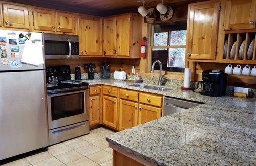 You will love the privacy of Our Cabin at Eagle's Ridge Resort - one of Pigeon Forge's finest cabin communities. The large master suite includes a Jacuzzi and king size bed. A Queen size and a full/twin bunk bed in the other two rooms. A sleeper sofa with Serta mattress in the living room means you can sleep up to nine. A true log cabin inside and out with high vaulted ceiling and large windows. Enjoy the warmth of the gas log fireplace, prepare meals in the spacious kitchen and recline in the open living area while watching the 55" flat screen TV. High speed internet, streaming TV and WIFI are accessible throughout. Fantastic video arcade and foosball table provide additional family entertainment. Grill on the back porch, swing on the front porch or just relax in the hot tub and listen to your favorite music on Bluetooth. All this just 10 minutes from Dollywood; the shopping, restaurants and amusements on the Parkway; the charm of Gatlinburg and the majestic beauty, hiking, picnicking and more in the Great Smoky Mountains.