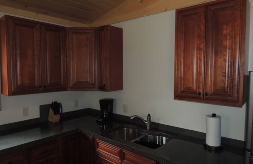 The cabin comfortably sleeps up to 6 people. There are two private bedrooms – each has a queen size bed, spacious armoire closet, large chest of drawers, and nightstand. While bright natural sunlight normally fills the bedroom, there are room darkening shades for a peaceful sleep. There is a queen size pull-out couch in the living room that accommodates two more people. There is one bathroom with shower stall. Open year-round, the cabin has with radiant floor heating to warm you on chilly nights, as well as air conditioning and ceiling fans in each room to cool you on warm summer days.