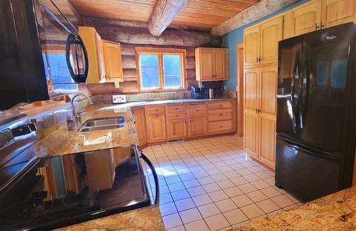 Find peaceful serenity in our magnificent, handcrafted Scandinavian style larch log home that shows off the natural beauty of log construction at its finest. Cozy up to the beautiful centrally located gas fireplace, prepare meals in our custom kitchen featuring pecan solid wood cabinets, granite countertops and bar seating and then dine together at our large Amish built log dining table that seats 8, or el fresco on one of several decks and patio’s. The lodge themed great room is the perfect space for everyone to convene and share in conversation or relax streaming your favorite movies on our smart TV. With 1 GB of high speed Wifi, you can have confidence that you are connected to the outside world even while escaping it.